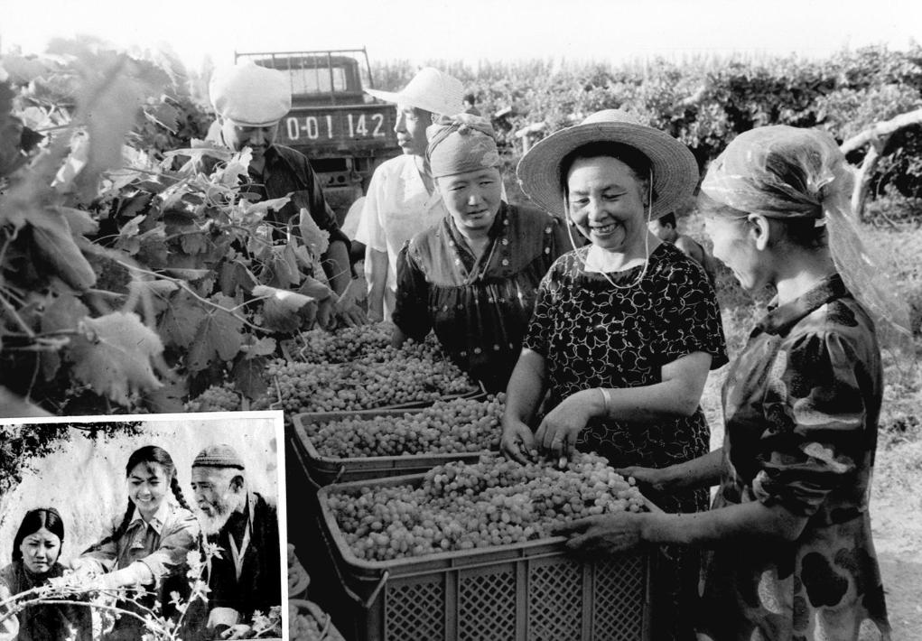 在新疆吐鲁番拍摄的高级农艺师王惠珠(右上图右二)。1954年,王惠珠来到吐鲁番,投身于葡萄生产新技术推广工作(左下图中)。她在吐鲁番安家落户,为发展这里的葡萄生产奋斗了几十年,退休后仍致力于葡萄品种的更新、改良和推广(1990年10月16日发)。