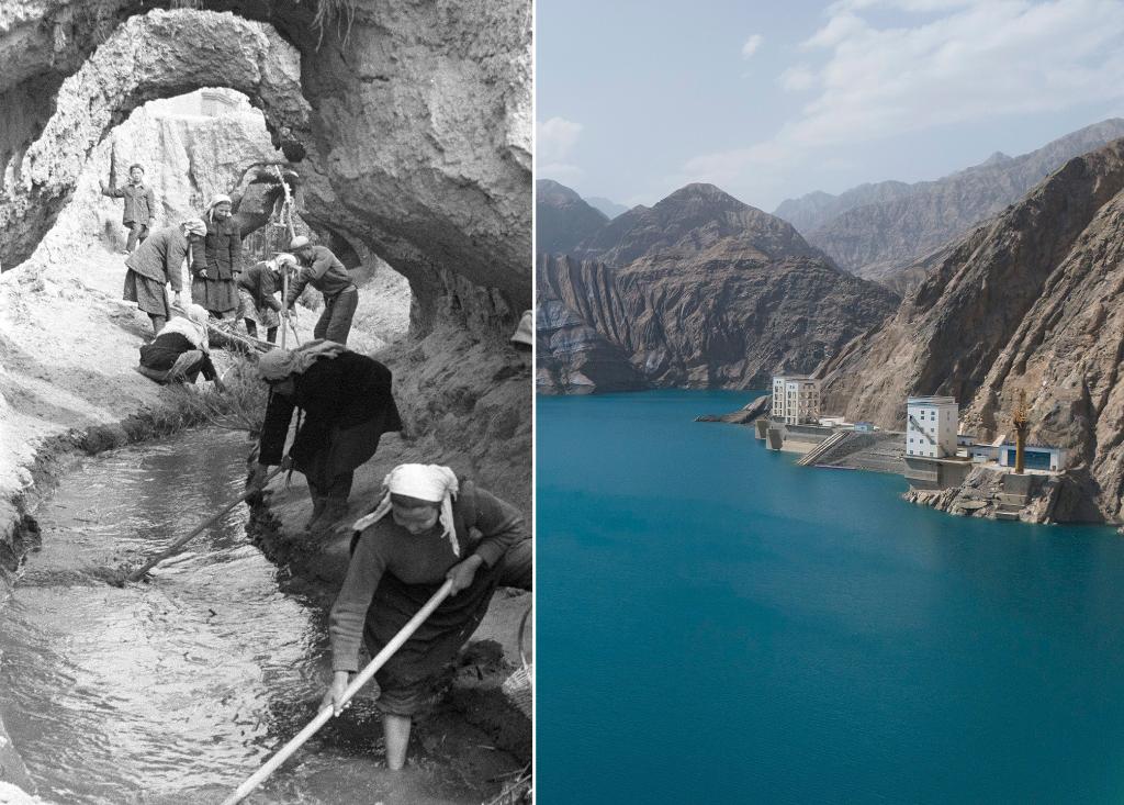 拼版照片:左图为1963年新疆吐鲁番群众在整修坎儿井渠道。(新华社记者 武纯展 摄);右图为2025年8月7日拍摄的新疆目前规模最大的水利枢纽工程阿尔塔什水库,该工程兼顾生态、防洪、灌溉、发电等功能,2021年8月建成投产以来,平均每年向塔里木河干流生态补水约3.3亿立方米,彻底解决了叶尔羌河千年水患,每年减少约1000万人次的防洪投入;同时为南疆提供清洁能源,改善了南疆的电力短缺状况。(新华社记者 周佳谊 摄)