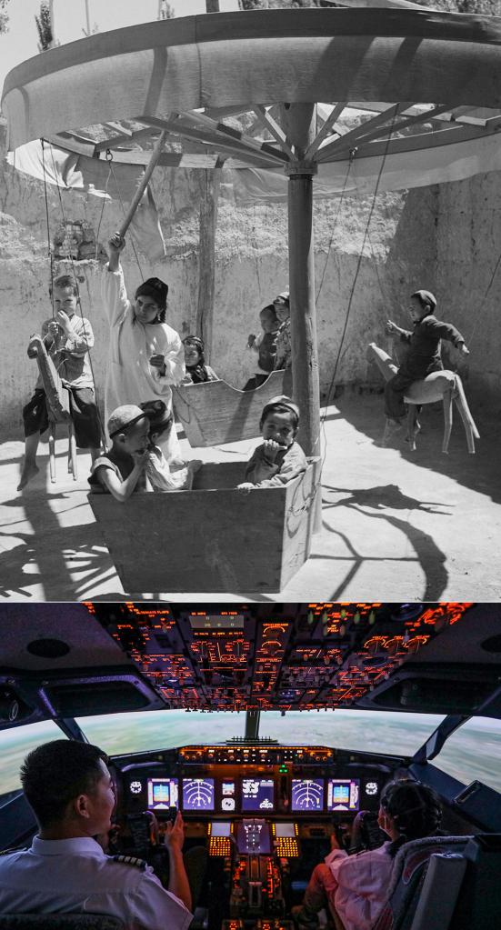 拼版照片,上图为新疆维吾尔自治区喀什市郊区幼儿园的维吾尔族孩子们在游戏(1960年5月28日发,新华社记者 武纯展 摄);下图为2022年6月19日,在南航新疆基地,来自乌鲁木齐市金太阳幼儿园的刘灼曦(右)在飞行教员的指导下,体验双座737IPT程序模拟机飞行。(新华社记者 王菲 摄)