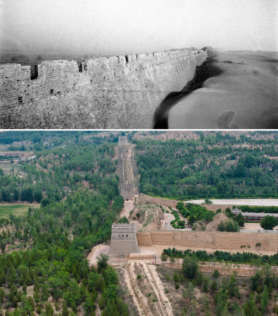 拼版照片,上图:1953年,陕西省榆林县常乐堡的西城墙被沙漠埋没了大部分,有的地方沙漠甚至高出城墙一丈有余(新华社记者 武纯展 摄);下图:2024年6月6日拍摄的榆林镇北台附近的长城生态防护林带(新华社记者 邵瑞 摄)。陕西省榆林市地处毛乌素沙地与黄土高原过渡地带,曾饱受风沙与水土侵蚀危害。几十年来,在一代代治沙人和水土保持工作者的努力下,通过大规模生态治理,榆林市的生态环境面貌发生了根本性变化。如今,榆林市860万亩流沙全部得到固定或半固定,全市林木覆盖率36%,累计治理水土流失面积1.8万多平方公里,长城内外重新披上绿装,“塞上明珠”焕发勃勃生机。