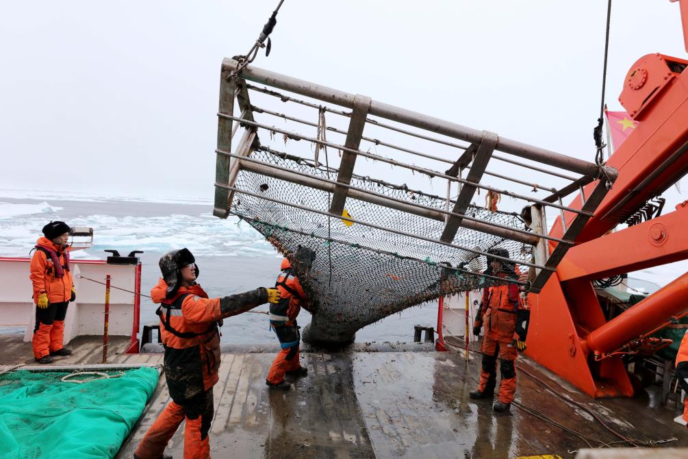 图为考察队员在“雪龙2”号艉甲板进行箱式取样作业。新华社记者刘诗平 摄