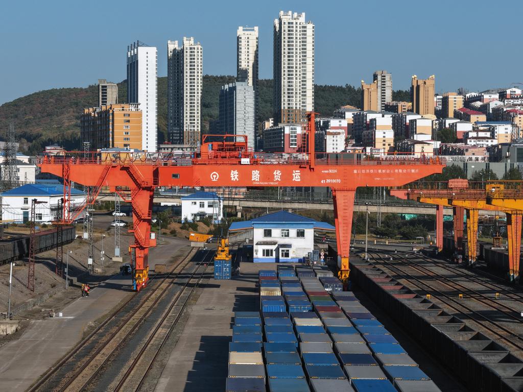 9月27日,在绥芬河站集装箱换装场,龙门吊在对回程中欧班列进行换装作业(无人机照片)。