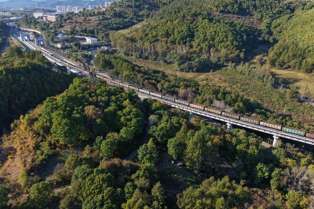 9月27日,满载大宗品类货物的入境列车在滨绥铁路绥芬河至国境线提质改造工程新线路上行驶(无人机照片)。