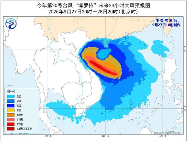 大风预报:27日20时至28日20时,南海大部、北部湾、琼州海峡、广东中西部沿海、海南岛沿海、广西沿海将有6-8级、阵风9级的大风,其中,南海中部和西北部的部分海域、中沙群岛、西沙群岛、海南岛以南海域及沿海的风力有9-10级、阵风11-12级,台风中心经过的附近海域或地区风力可达11-13级、阵风14-15级。