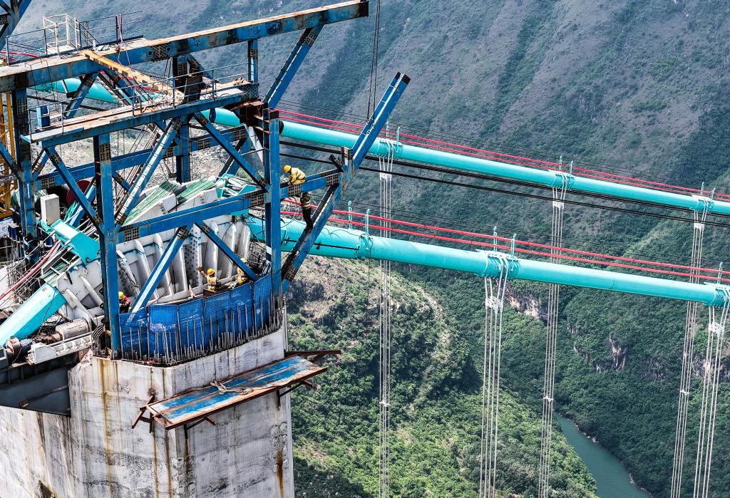 6月6日,工人在贵州花江峡谷大桥桥塔顶上施工(无人机照片)。新华社记者 杨文斌 摄