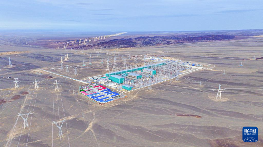 9月22日在新疆巴音郭楞蒙古自治州若羌县拍摄的三峡集团“疆电外送”第四通道电源项目施工现场(无人机照片)。