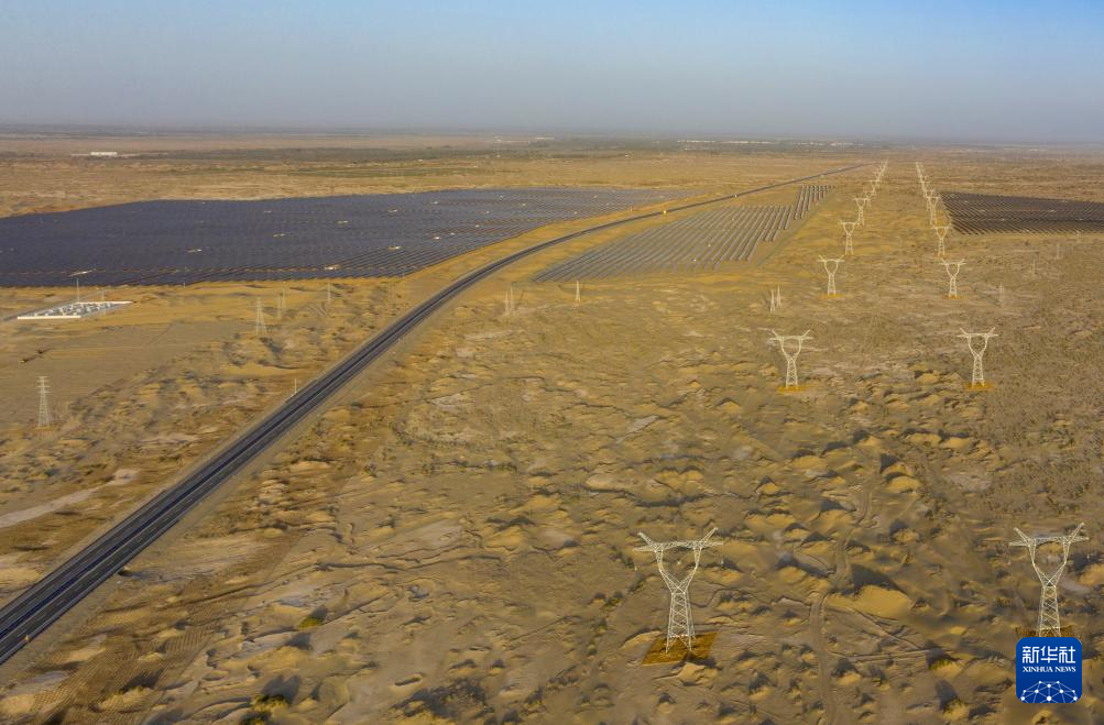 9月22日在新疆巴音郭楞蒙古自治州境内的乌若高速附近拍摄的光伏电站和输电线(无人机照片)。