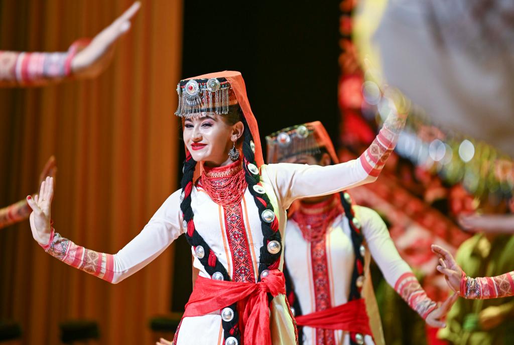 在新疆塔县葱岭演艺中心,青年舞蹈演员阿曼古丽·瓦比克参与音乐剧《拉齐尼·巴依卡》的演出(2025年3月22日摄)。