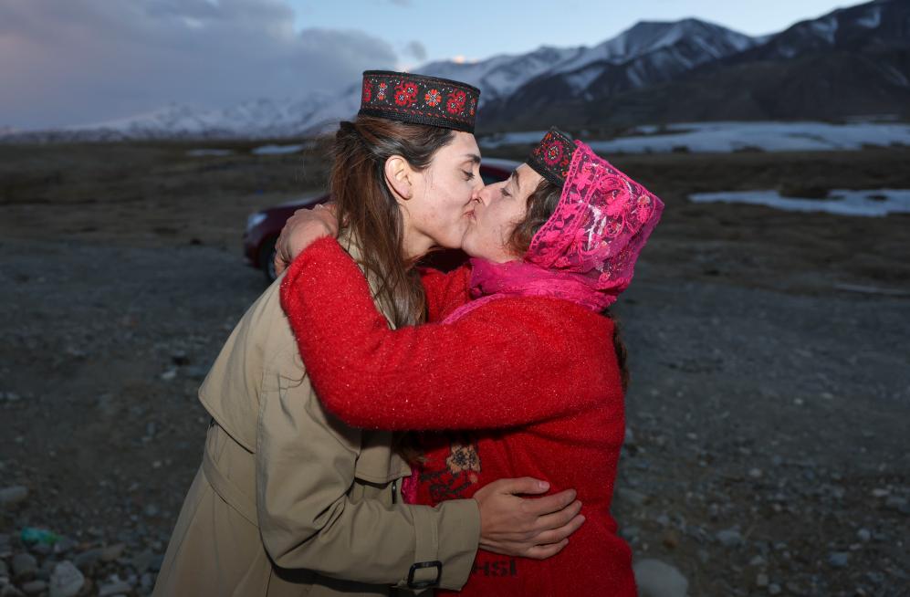 在新疆塔什库尔干塔吉克自治县瓦恰乡夏布孜喀拉村,一位长辈(右)和艾尔开牙·多力开告别(2024年3月22日摄)。