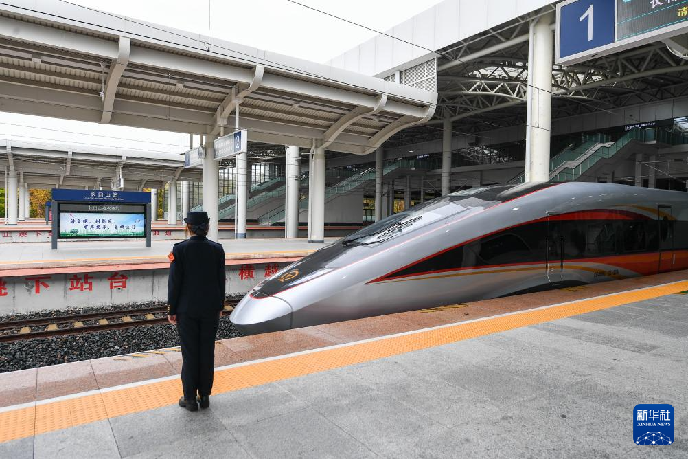 9月28日,从长白山站开往沈阳北站的G8166次列车驶入长白山站。新华社记者 张楠 摄