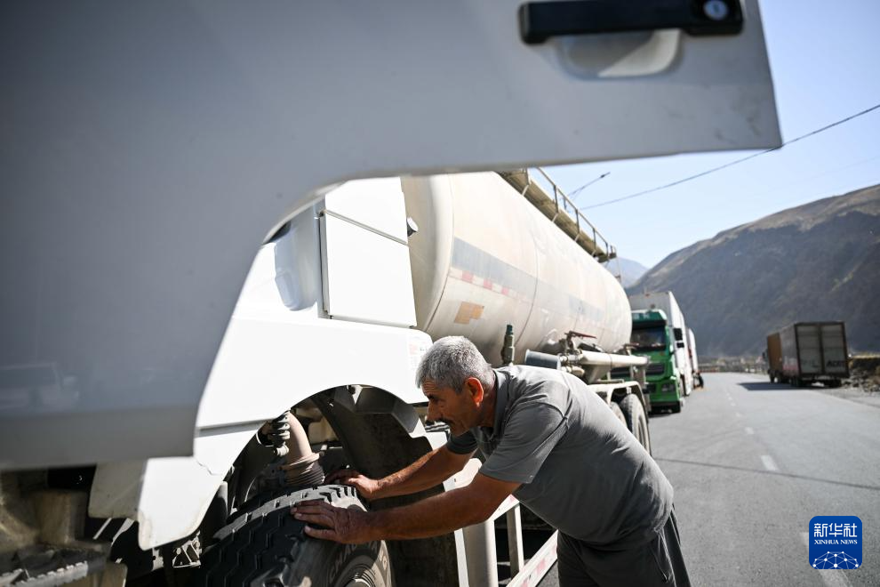 9月11日,在塔吉克斯坦卡拉依洪姆村附近,司机图拉洪检查车辆。 新华社记者 李任滋 摄