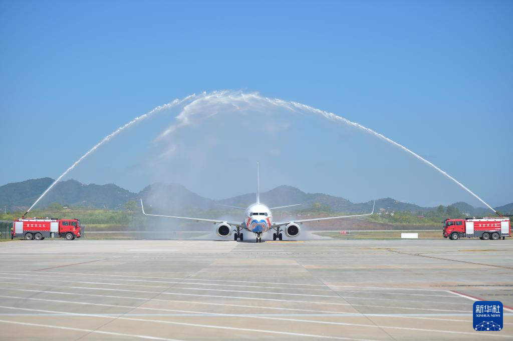 9月28日,由中国国际航空执飞的北京大兴至瑞金航班飞抵瑞金机场后通过“水门”。新华社发(杨鑫 摄)