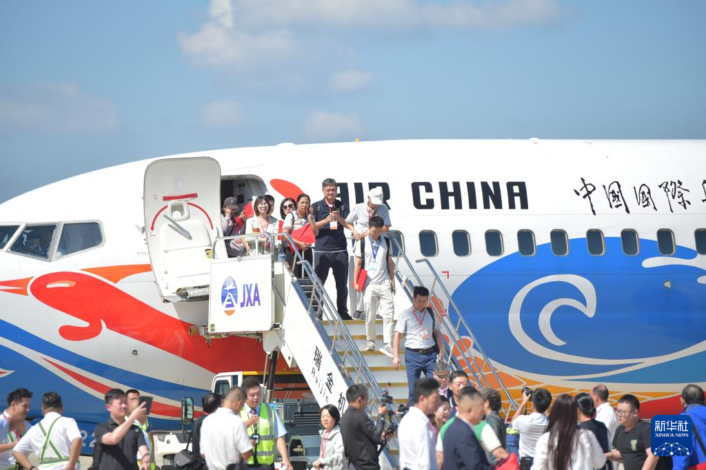 9月28日,由中国国际航空执飞的北京大兴至瑞金航班抵达瑞金后,乘客走出机舱。新华社发(杨鑫 摄)