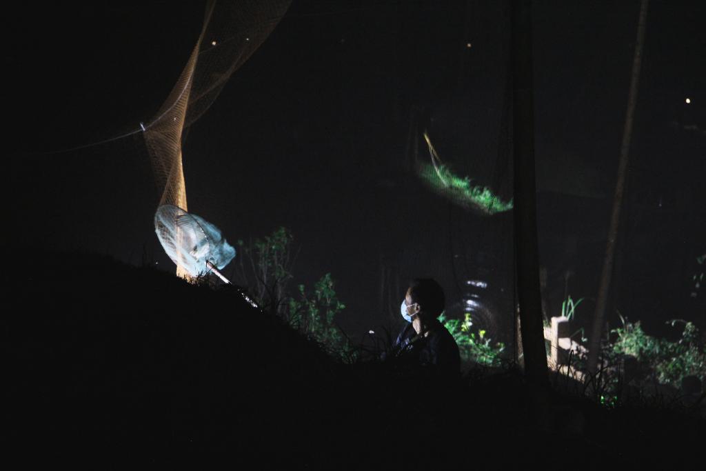 9月26日深夜,曾昭富在万鸟岭“捕鸟”。新华社记者陈浚武摄