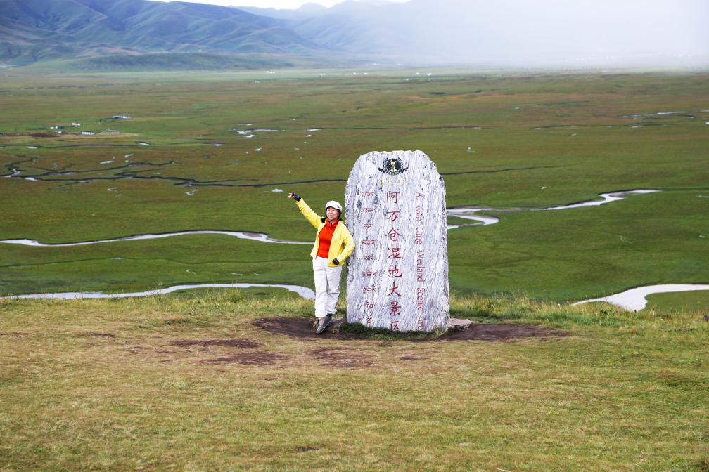 游客在阿万仓湿地拍照“打卡”。新华社记者马莎摄