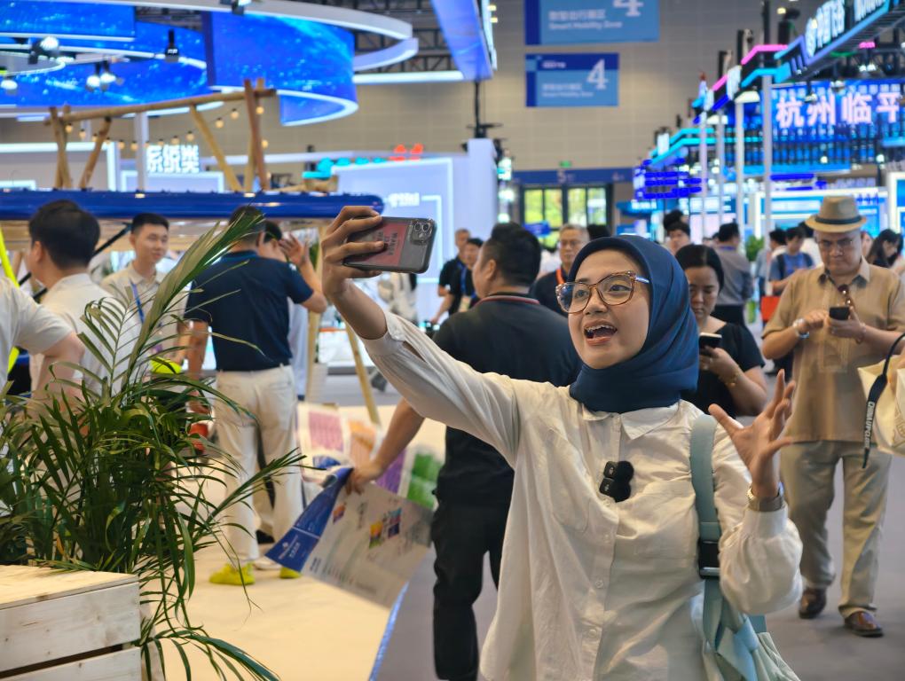 9月25日,在第四届全球数字贸易博览会上,印度尼西亚拉贾瓦里电视台的新闻记者奥利维娅·费拉里为电视台录制视频。新华社记者 刘梓漪 摄