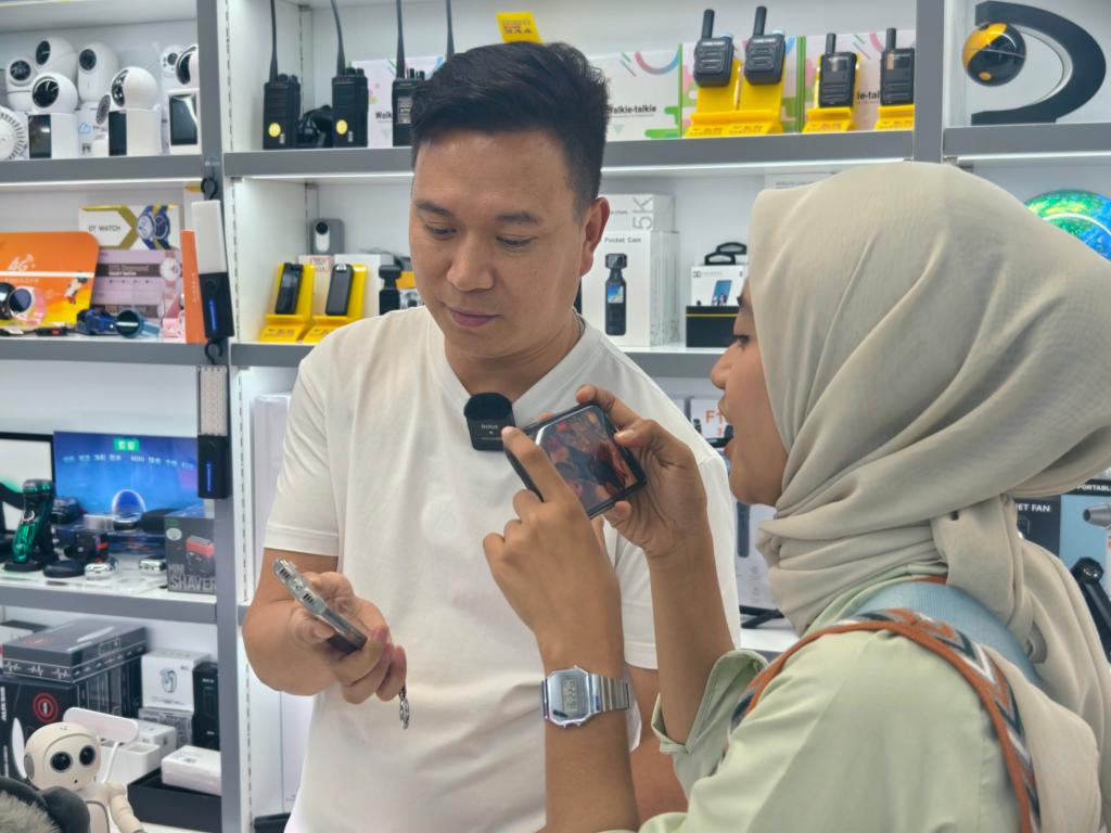 9月26日,在浙江金华义乌国际商贸城,印度尼西亚拉贾瓦里电视台的新闻记者奥利维娅·费拉里(右)使用AI翻译机与中国老板李军交流。新华社记者 刘梓漪 摄