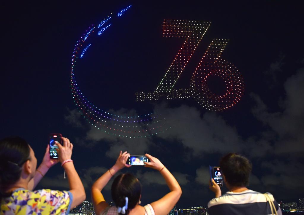 10月2日,香港举行大型无人机汇演,庆祝中华人民共和国成立76周年。新华社记者 陈铎 摄