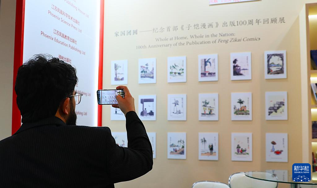 10月1日,在阿塞拜疆首都巴库举办的第十一届巴库国际书展上,参观者在中国展台拍摄纪念首部《子恺漫画》出版100周年回顾展。新华社记者 陈俊锋 摄