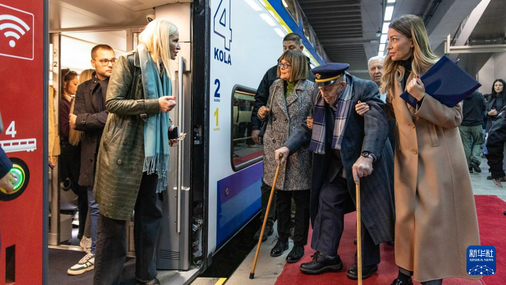 10月3日,在塞尔维亚首都贝尔格莱德,工作人员陪同塞尔维亚105岁的老人(右二)搭乘中企承建的匈塞铁路列车。新华社发(王韡摄)
