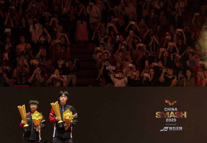 10月3日,在北京举行的2025年世界乒乓球职业大联盟(WTT)中国大满贯赛混合双打决赛后,冠军中国组合王楚钦(右)/孙颖莎在颁奖仪式上。新华社记者 鞠焕宗 摄