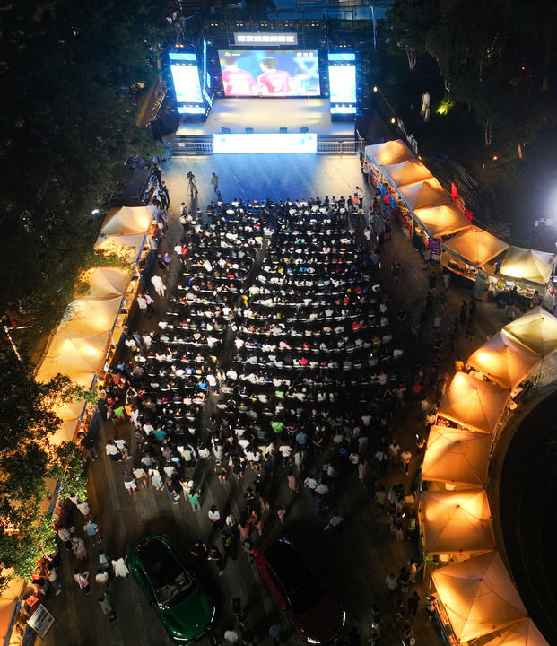 8月17日,球迷在南京一个露天屏幕前观看2025江苏省城市足球联赛(“苏超”)第九轮比赛。新华社记者 季春鹏 摄