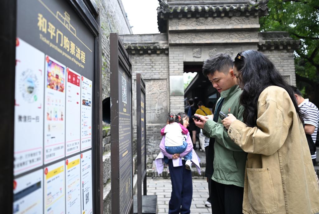 10月3日,游客在西安城墙和平门出入口扫码购票。新华社记者 李一博 摄