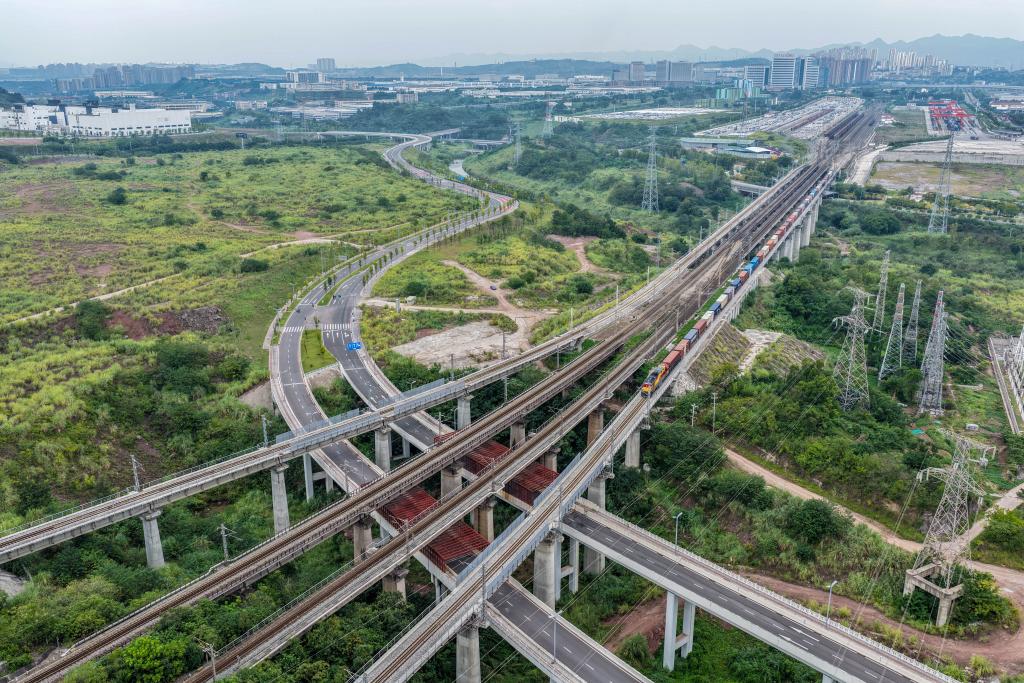 9月28日,西部陆海新通道班列在重庆鱼嘴站顺利发车(无人机照片)新华社记者 唐奕 摄