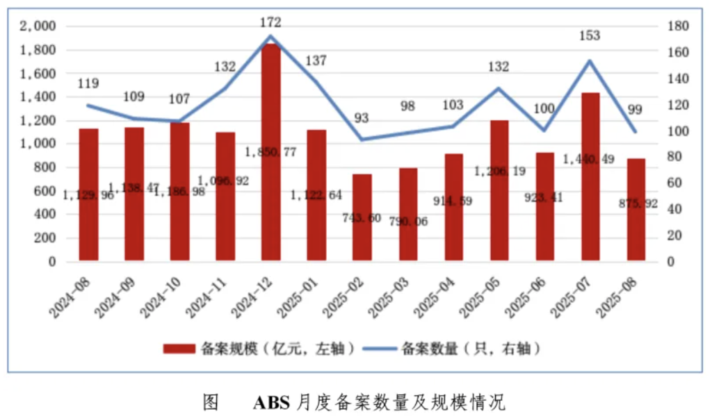 中国基金业协会最新发布的数据显示,2025年8月,资产支持专项计划(ABS)新增备案99只,新增备案规模合计875.92亿元。其中,基础设施公募REITs所投ABS备案1只,规模17.23亿元。