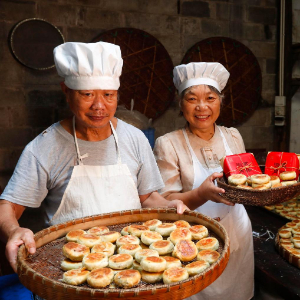9月25日,在安徽省黄山市休宁县万安老街,制饼手艺人程贵生(左)和妻子祝桂花展示制作好的“徽式麻仁月饼”。新华社发(施亚磊 摄)