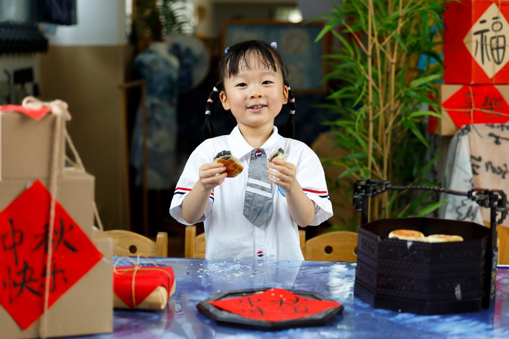 9月29日,在安徽省黄山市屯溪区一家幼儿园,小朋友在中秋活动中品尝“徽式麻仁月饼”。新华社发(施亚磊 摄)