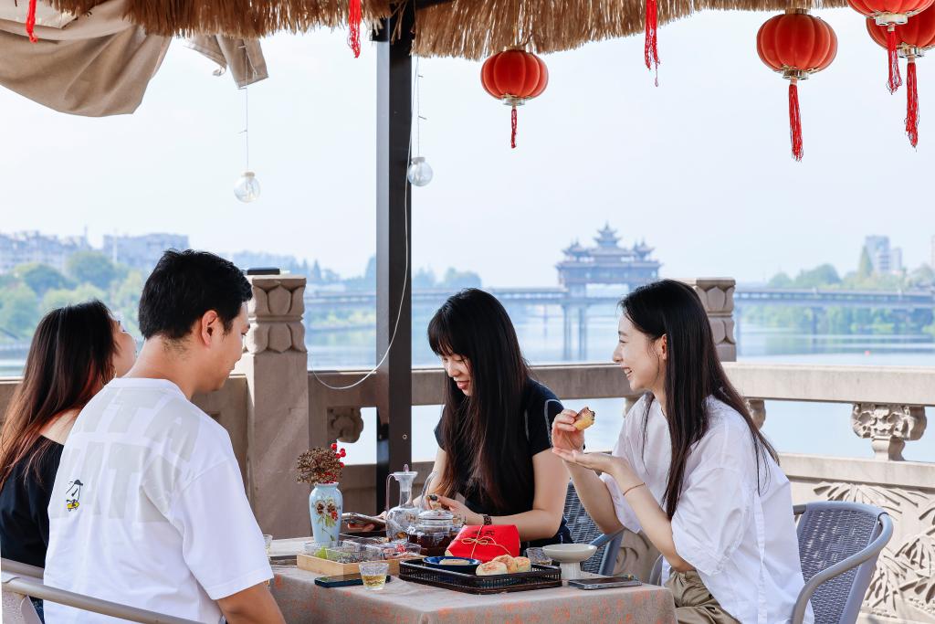 9月29日,市民在安徽省黄山市屯溪区品尝“徽式麻仁月饼”。新华社发(施亚磊 摄)