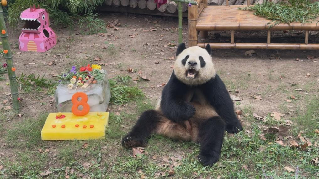 4日,在上海野生动物园大熊猫馆内,保育团队通过特色蛋糕、主题礼物和场景布置,为8周岁的大熊猫“雪宝”“芊金”以及6周岁的大熊猫“康康”打造了一场充满爱与创意的生日盛宴。
