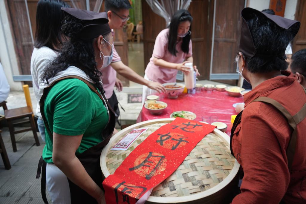 锣鼓打起来,随着有人高喊的“开席”声,竹笼从后厨依次递出,热气裹着香味漫过长街,花椒鸭的麻、藕夹的鲜、桂花酒的甜,混在一起,这场融合了美食与非遗的中秋盛宴正式启幕。