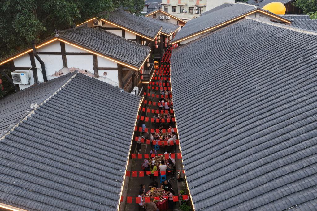 百张圆木桌沿青石板路依次排开,竹笼传递着热气蒸腾的佳肴,桌角摆着提前备好的月饼与桂花酒……中秋佳节,重庆北碚区偏岩古镇举办长街宴、老物图文展等特色活动,融合主题音乐夜等现代元素,让游客在传统与创新的交融中感受古镇文化魅力。