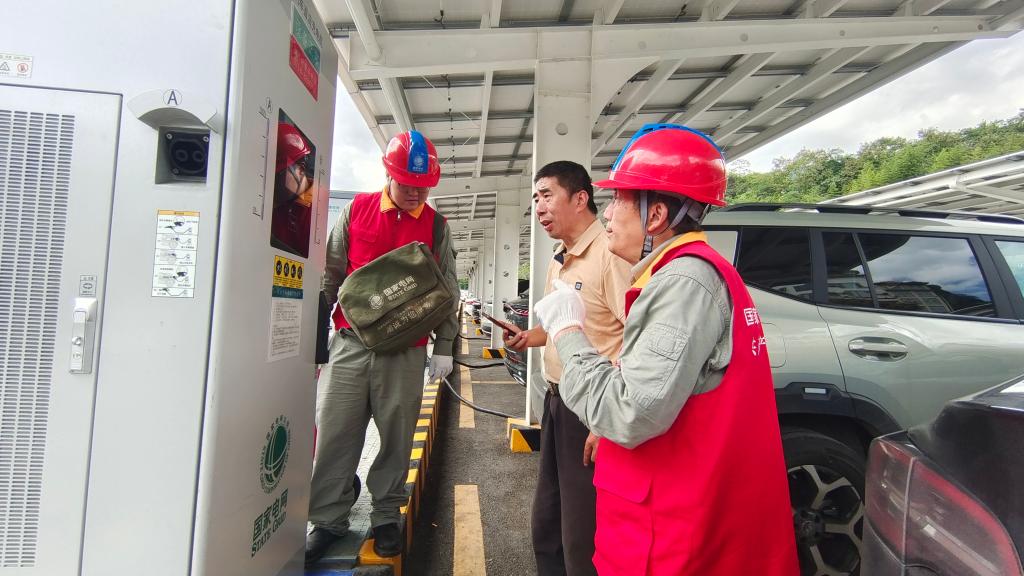 接下来,他们走向位于山腰的国家电网“光储充一体化”停车场。这个停电场车棚顶部铺设了432.05千瓦光伏板、地面配套储能装置,不仅能为新能源车充电,还能实现清洁能源就地消纳、削峰填谷。走进停车场,覃建皓和谭永军仔细检查充电桩显示屏是否正常、电缆接头有无破损,查看电气元件是否松动、发热。