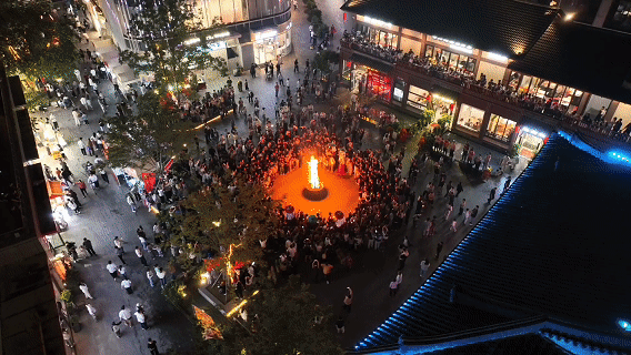 中秋节来临之际,位于安徽省阜阳市颍州区的双清湾水街热闹非凡,一场延续近800年的中秋火把祈福习俗焕新登场,连串的火把依次亮起,如火龙蜿蜒穿行,吸引近5000名市民打卡。