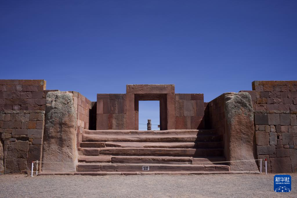 这是8月19日在玻利维亚蒂亚瓦纳科古城遗址拍摄的重要建筑遗迹——太阳门。 新华社记者 赵凯 摄
