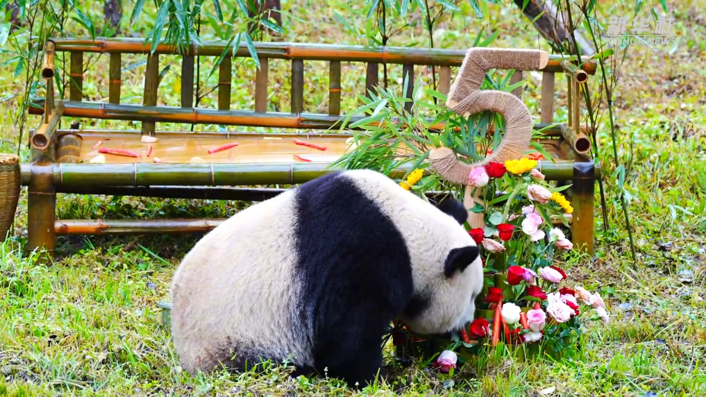 10月11日,在陕西汉中洋县华阳景区,大熊猫“秦华”迎来五岁生日。为庆祝“秦华”的生日,工作人员用竹筒、鲜花制作了特殊的“生日蛋糕”,竹筒里还装着它爱吃的苹果、胡萝卜。