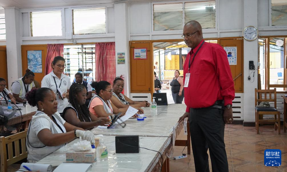10月11日,赫米尼耶(右)在塞舌尔首都维多利亚的一处投票站进行投票前登记。新华社发