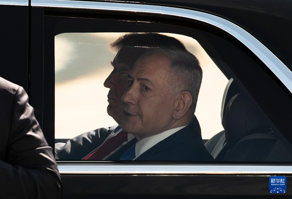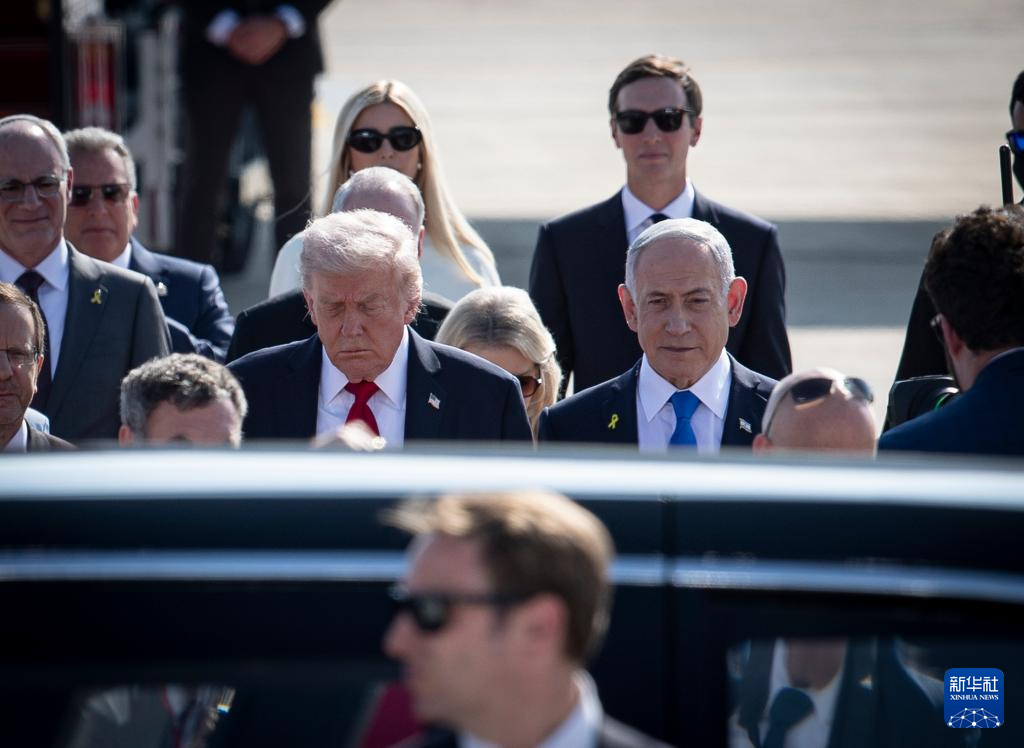 10月13日,在以色列本-古里安机场,以色列总理内塔尼亚胡(前)同到访的美国总统特朗普同乘一辆车。新华社记者 陈君清 摄