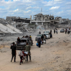 10月12日,在加沙地带南部汗尤尼斯,重返家园的巴勒斯坦人走过严重受损的建筑。新华社发(里泽克·阿卜杜勒贾瓦德摄)