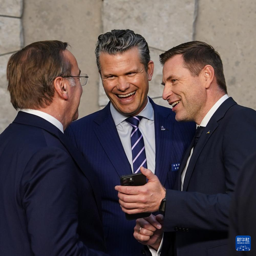 10月15日,在比利时布鲁塞尔举行的北约防长会议结束后,美国国防部长赫格塞思(中)与爱沙尼亚国防部长佩夫库尔(右)、德国国防部长皮斯托里乌斯交谈。新华社记者 彭子洋 摄