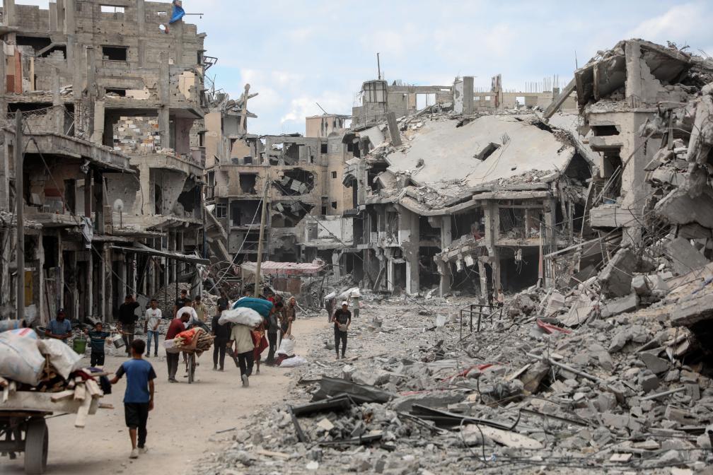 10月12日,在加沙地带南部汗尤尼斯,重返家园的巴勒斯坦人走过严重受损的建筑。新华社发(里泽克·阿卜杜勒贾瓦德摄)