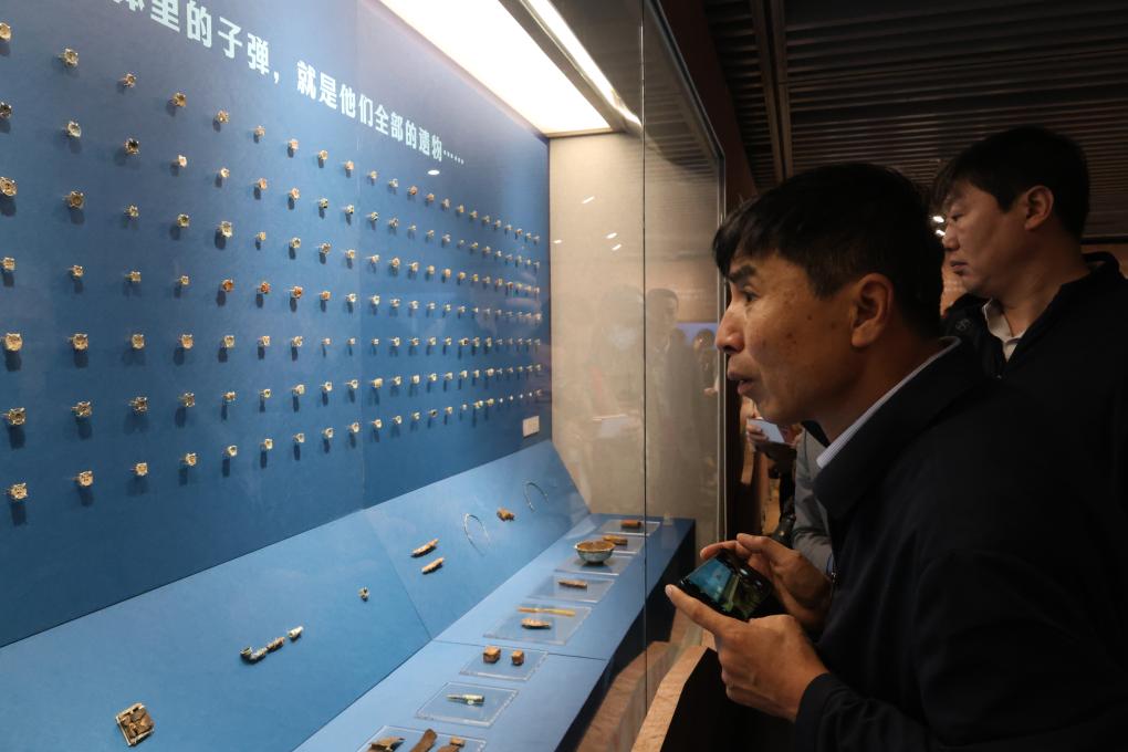 10月20日,“愿以此身长报国——纪念中国人民抗日战争暨世界反法西斯战争胜利80周年专题展”在中共一大纪念馆开幕,观众瞻仰烈士遗物——军装上的纽扣及身体里的子弹。(潘宗源 摄)