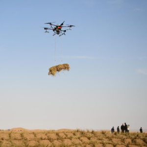 在阿拉善左旗“三北”六期工程蒙甘边境防沙治沙沙漠锁边项目现场,200多名治沙工人俯身沙海,将一株株花棒苗植入沙土中。“我们运用无人机苗木调运技术,以智能化手段替代人力,大幅提升种植效率与精准度,为造林工作注入科技动能。”内蒙古阿拉善左旗蓝马园林生态建设有限责任公司副总经理刘海军说。