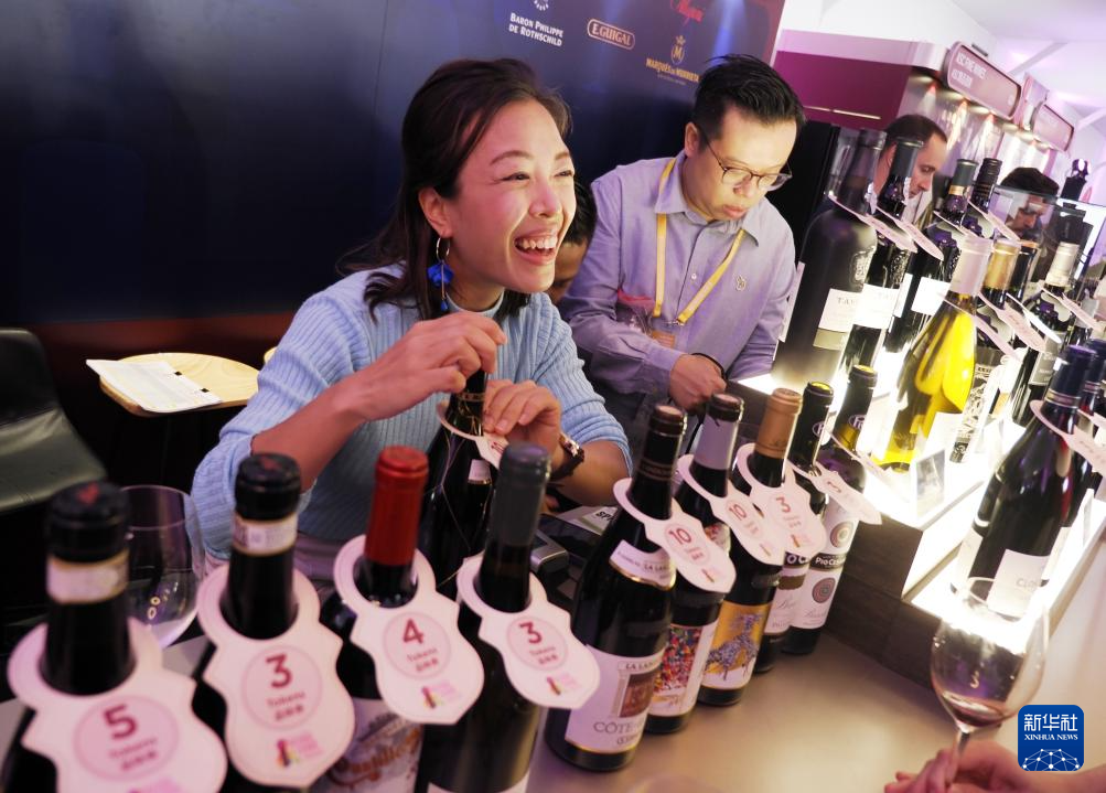 10月23日,在香港中环海滨,参展商在推介红酒。新华社发(王申 摄)
