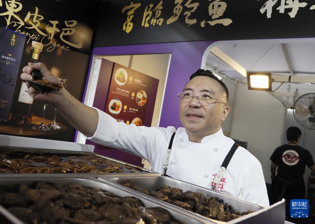 10月23日,在香港中环海滨,参展商在推介香港传统美食。新华社发(王申 摄)