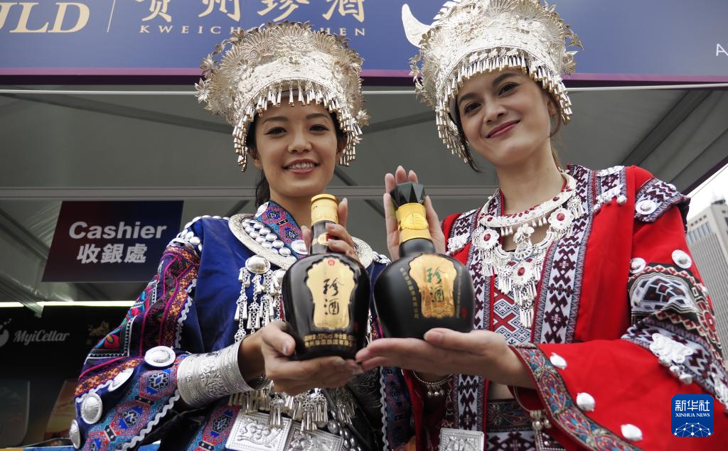 10月23日,在香港中环海滨,身穿民族服饰的工作人员在展示来自贵州的白酒。新华社发(王申 摄)