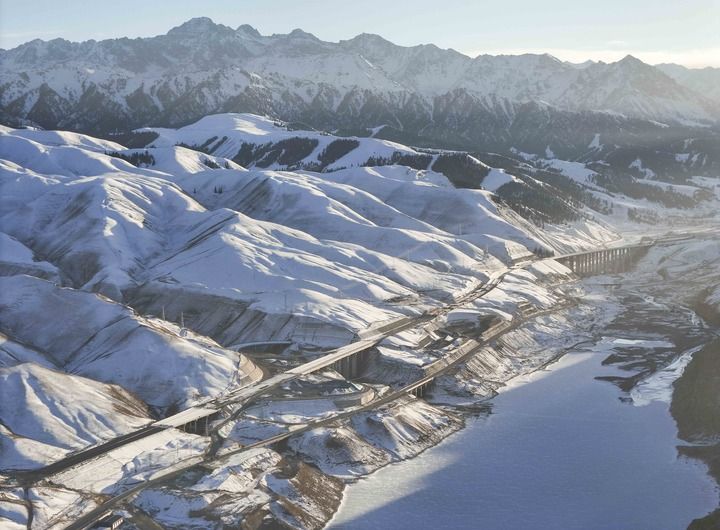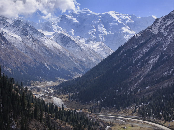 金秋时节,沿着天山北坡西行,公路与铁路并行,汽车、中欧(中亚)班列疾驰在天山脚下。放眼远眺,雪山傍着棉田,美不胜收。穿越咽喉要道果子沟,进入伊犁河谷。天山三丈雪,修路正当时。西陲天山腹地,有数千名筑路人在忙碌。
